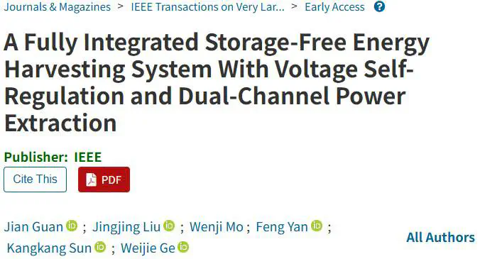 Jian Guan’s paper, “A Fully Integrated Storage-Free Energy Harvesting System With Voltage Self-Regulation and Dual-Channel Power Extraction” has been accepted for publication in the IEEE Transactions on Very Large Scale Integration (VLSI) Systems. Congratulations to Jian Guan for his paper being accepted.